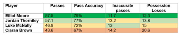 Ciaron Brown's long pass accuracy (28.4%) is well below Moore (36.2%), McNally (36.5%) and Thorniley (40.8%), further showing Brown's limitations when progressing the ball.